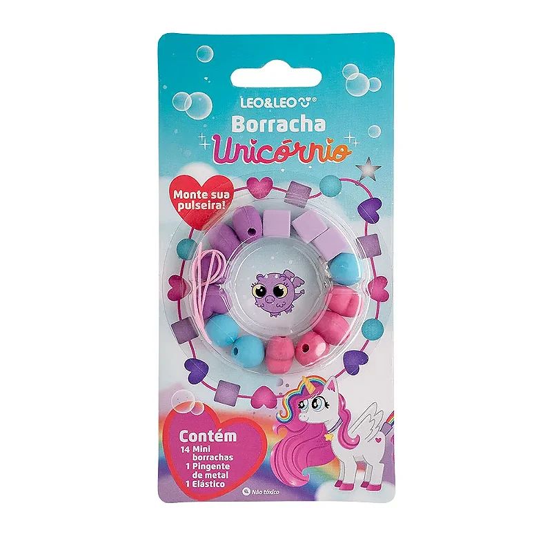 A Borracha Pulseira Unicórnio Leo&Leo une diversão e funcionalidade, permitindo montar sua própria pulseira enquanto oferece um item de papelaria criativo.