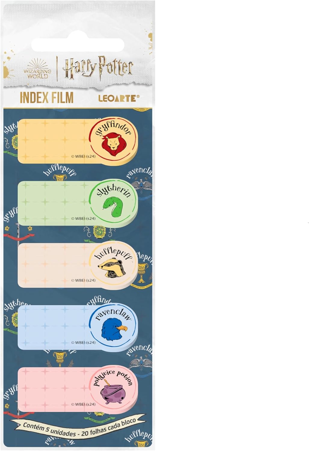 Coloridos, são 5 blocos de notas adesivas e em formato retangular, com 20 folhas cada. Os Potterheads vão amar as ilustrações, pois são lindas e baseadas nas casas de Harry Potter: Gryffindor, Slytherin, Ravenclaw e Hufflepuff, além do caldeirão de Polyjuice Potion.