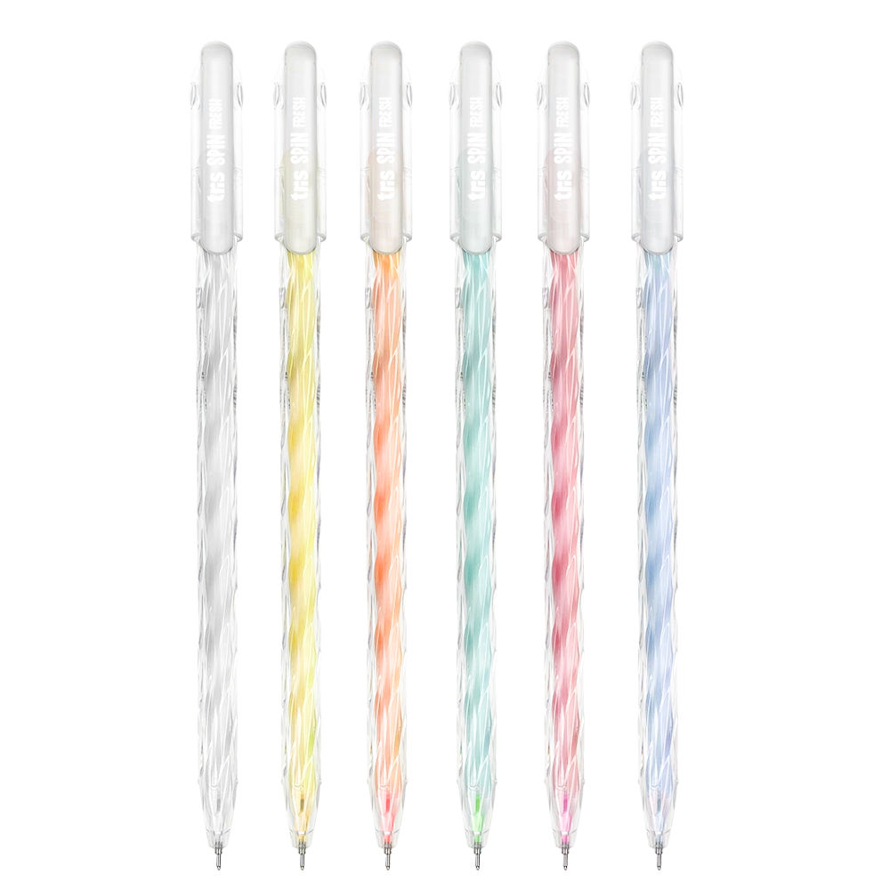 6 canetas gel Spin Fresh Tris com corpo espiral, nas cores branca, amarela, laranja, verde, rosa e azul.