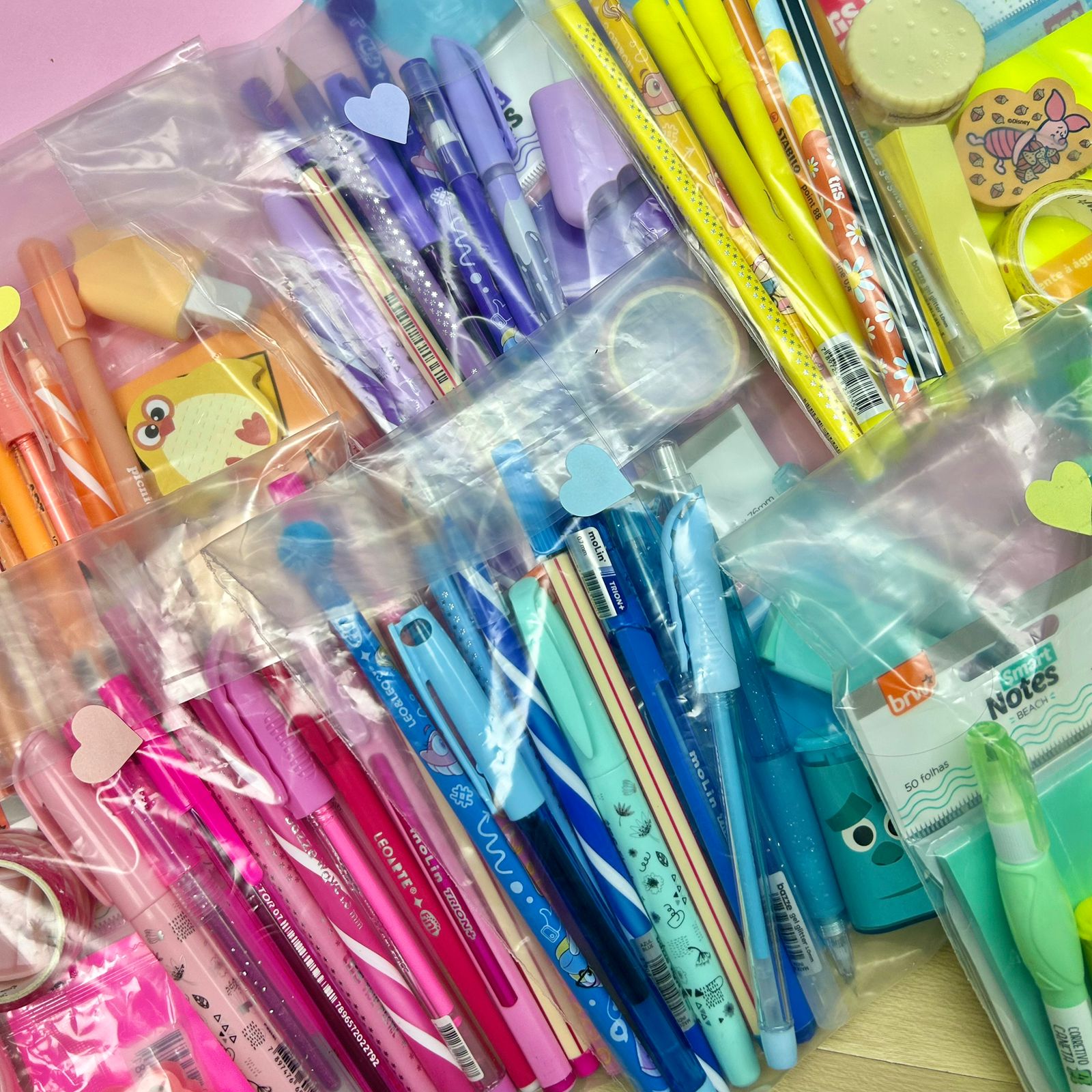 Kit Papelaria 15 Itens Completo Escolar e Escritório - Caneta, Corretivo, Fita, Borracha, Apontador e muito mais !